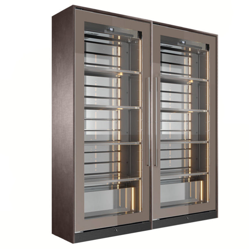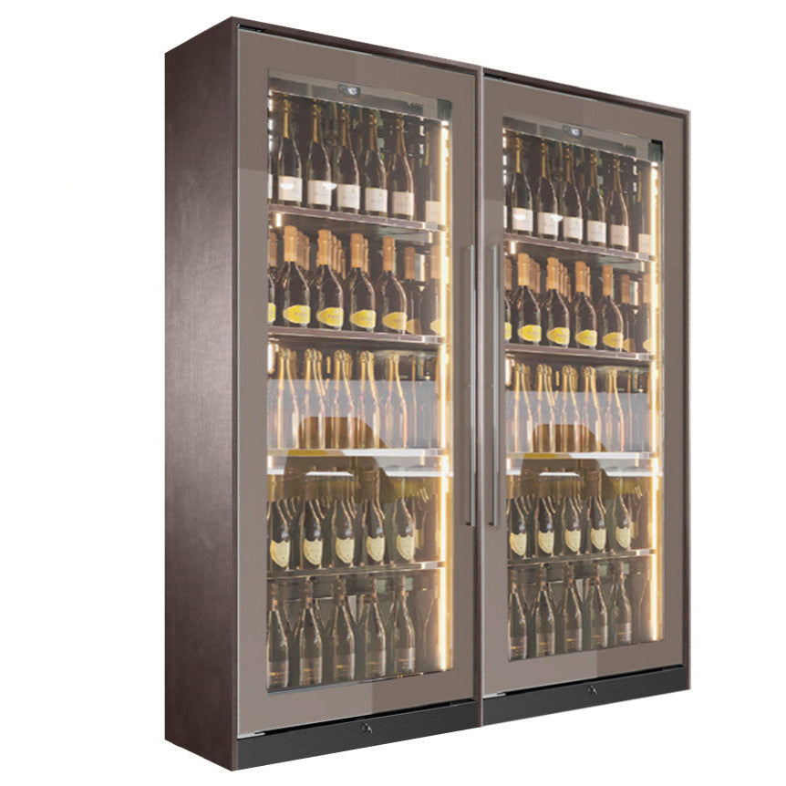 Die interne LED-Beleuchtung entlang der Seitenwände und die Innenräume aus Stahl erzeugen einen besonderen Tiefeneffekt und eindrucksvolle Lichtspiele, die die visuelle Wirkung der Flaschen verstärken und einen hellen und einladenden Raum schaffen.