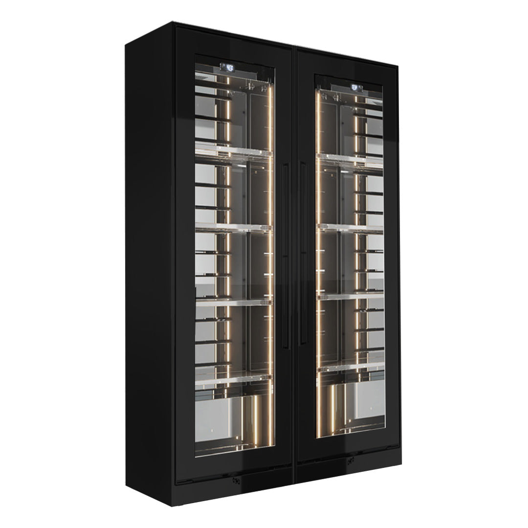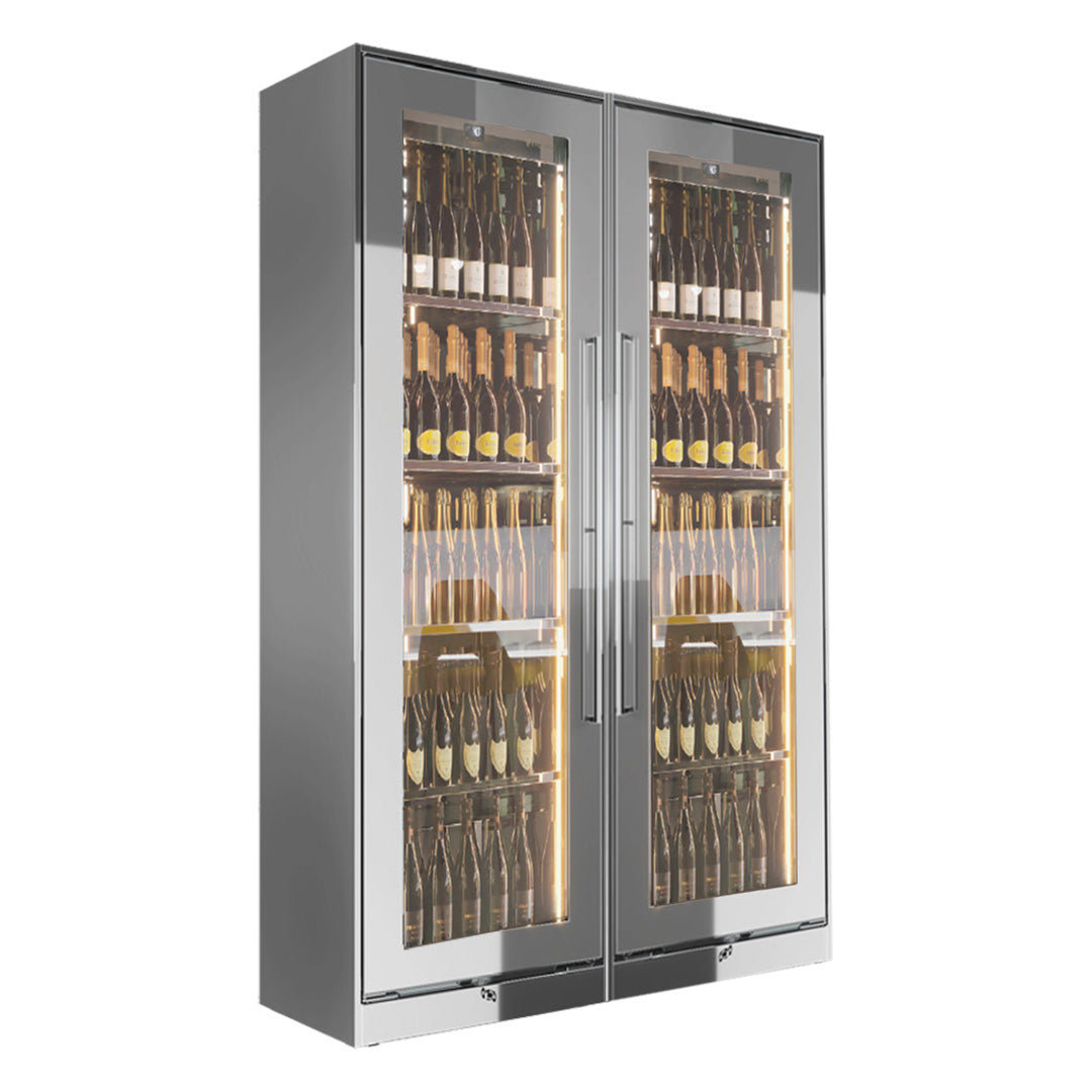 Die interne LED-Beleuchtung entlang der Seitenwände und die Innenräume aus Stahl erzeugen einen besonderen Tiefeneffekt und eindrucksvolle Lichtspiele, die die visuelle Wirkung der Flaschen verstärken und einen hellen und einladenden Raum schaffen.