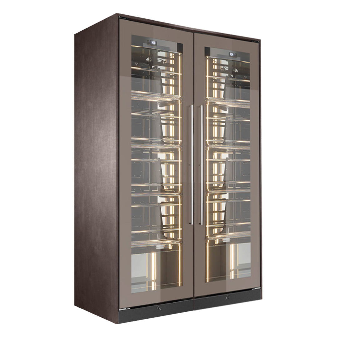 Die interne LED-Beleuchtung entlang der Seitenwände und die Innenräume aus Stahl erzeugen einen besonderen Tiefeneffekt und eindrucksvolle Lichtspiele, die die visuelle Wirkung der Flaschen verstärken und einen hellen und einladenden Raum schaffen.