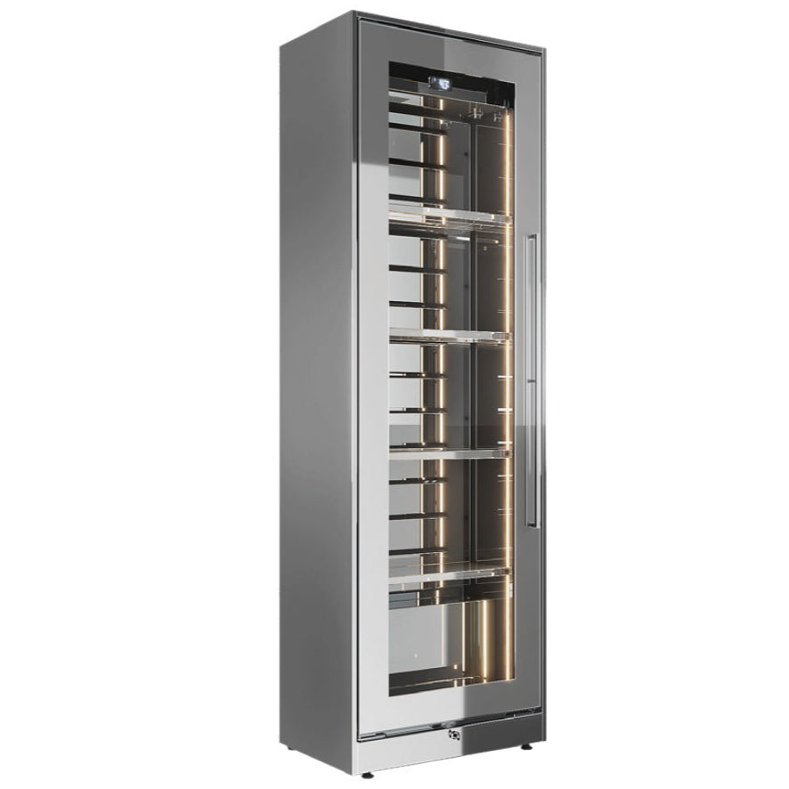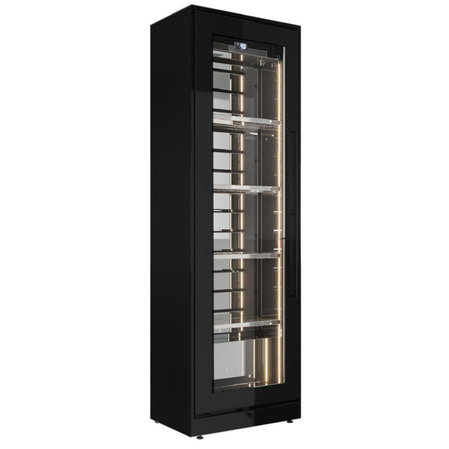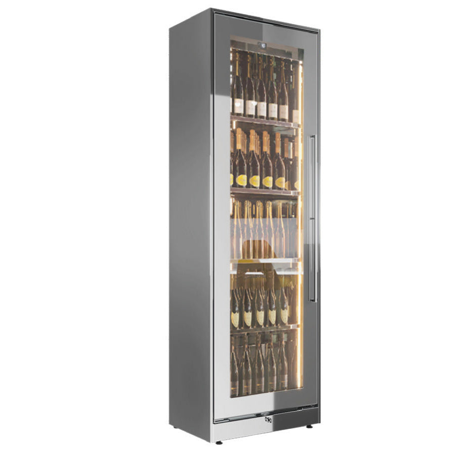 Die vertikal entlang des Korpus und des Stahlinnenraums eingesetzten LEDs (2700°K) erzeugen einen Tiefeneffekt und eine besondere Beleuchtung, die die Flaschen in den Vordergrund rückt.