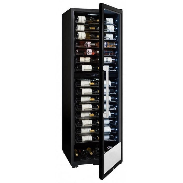 <p><span style="color:rgb(33,43,54);">Capacity: 152 bottles*</span><br><span style="color:rgb(33,43,54);" >Free installation</span><br><span style="color:rgb(33,43,54);">Color: black door frame and stainless steel plate</span><br><span style=" color:rgb(33,43,54);">Cooling system: compressor</span><br><span style="color:rgb(33,43,54);">Refrigeration: Ventilated</span> <br><span style="color:rgb(33,43,54);">Temperature adjustable from:</span><br><span style="color:rgb(33,43,54);"> - upper zone: 5°C-12°C/63 Bottles</span><br><span style="color:rgb(33,43,54);">- lower zone: 12°C-20°C /89 Bottles</span><br><span style="color:rgb(33,43,54);">Electronic regulation</span><br><span style="color:rgb(33,43, 54);">Digital thermometer with white display</span><br><span style="color:rgb(33,43,54);">Vertical and horizontal white LED lighting</span><br><span style="color:rgb(33,43,54);">Reversible glass door with lock, double gray tempered glass with anti-UV treatment</span><br><span style="color:rgb(33,43) ,54);">Compatible with the application&nbsp;</span><a href="https://cdn.shopify.com/s/files/1/0561/8535/6486/files/VINOTAG.pdf?v =1663343823"><span style="color:rgb(150,0,0);"><strong>VINOTAG®</strong></span></a><br><span style="color:rgb (33,43,54);"><i>(see characteristics, in collaboration with VIVINO)</i></span></p>