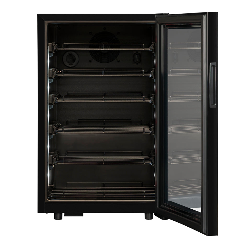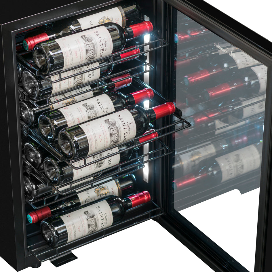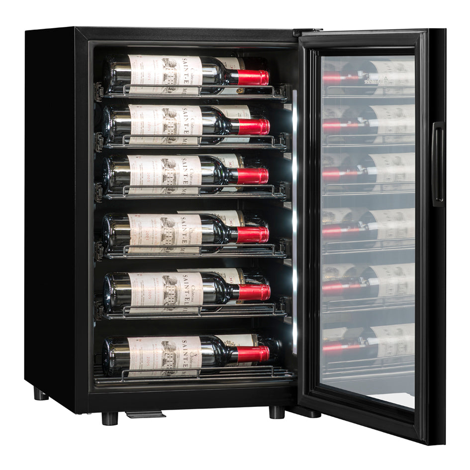 <p><span style="color:rgb(33,43,54);">Capacity: 22 bottles*</span><br><span style="color:rgb(33,43,54);" >Free installation</span><br><span style="color:rgb(33,43,54);">Color: Black frame and door</span><br><span style="color:rgb( 33,43,54);">Cooling system: compressor</span><br><span style="color:rgb(33,43,54);">Refrigeration: Ventilated</span><br>< span style="color:rgb(33,43,54);">Temperature adjustable from 5° to 20°C</span><br><span style="color:rgb(33,43,54);" >Electronic regulation</span><br><span style="color:rgb(33,43,54);">Digital thermometer with white display</span><br><span style="color:rgb(33) ,43,54);">White LED lighting on both side walls</span><br><span style="color:rgb(33,43,54);">Fullglass glass door with lock, smoked glass tempered with UV protection</span><br><span style="color:rgb(33,43,54);">Compatible with the application&nbsp;</span><a href="https://cdn. shopify.com/s/files/1/0561/8535/6486/files/VINOTAG.pdf?v=1663343823"><span style="color:rgb(150,0,0);"><strong>VINOTAG® </strong></span></a><br><i>(see characteristics, in collaboration with VIVINO)</i></p>