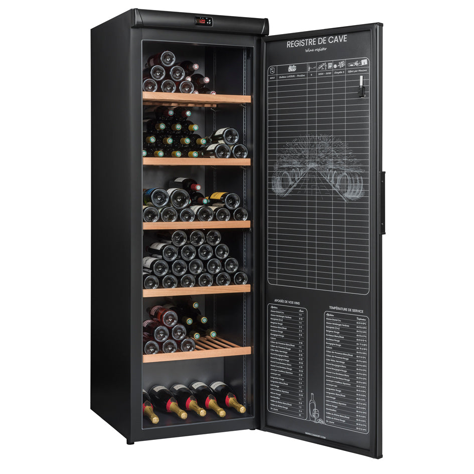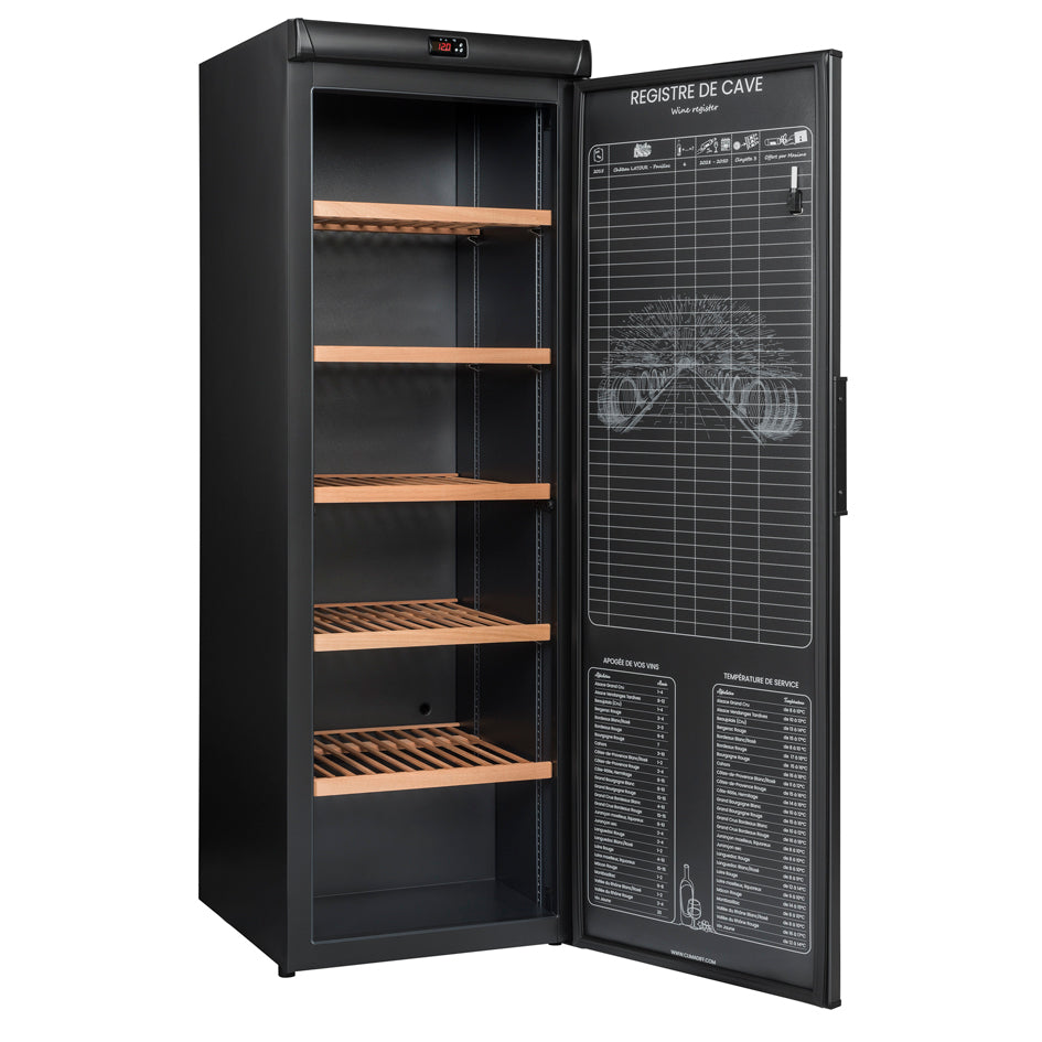 <p><span style="color:rgb(33,43,54);">Capacity: 264 bottles*</span><br><span style="color:rgb(33,43,54);" >Free installation</span><br><span style="color:rgb(33,43,54);">Color: Black</span><br><span style="color:rgb(33,43) ,54);">Cooling: Compressor</span><br><span style="color:rgb(33,43,54);">Temperature adjustable from 5° to 18°C</span><br> <span style="color:rgb(33,43,54);">Electronic regulation</span><br><span style="color:rgb(33,43,54);">Electronic thermometer with digital display </span><br><span style="color:rgb(33,43,54);">Full door with internal blackboard</span><br><span style="color:rgb(33,43, 54);">Compatible with the application&nbsp;</span><a href="https://cdn.shopify.com/s/files/1/0561/8535/6486/files/VINOTAG.pdf?v= 1663343823"><span style="color:rgb(150,0,0);"><strong>VINOTAG®</strong></span></a><br><span style="color:rgb( 33,43,54);"><i>(see characteristics, in collaboration with VIVINO)</i></span></p>