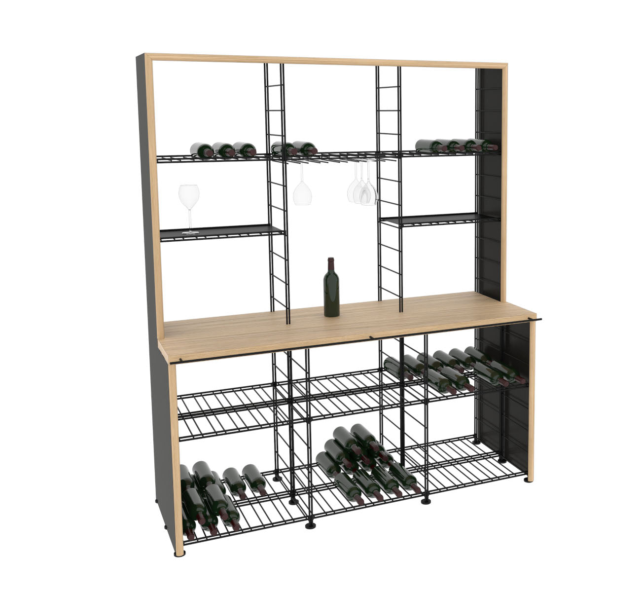 <p>Professional system for the storage and <strong>precise arrangement by type and vintage</strong> of your bottles.<br>Made of high-resistance steel, black lacquered anti-corrosion treatment and beech wood.<br>Double depth with support bench.</p>