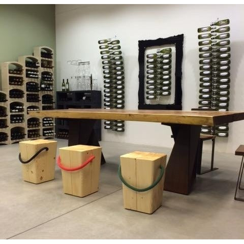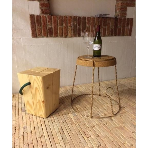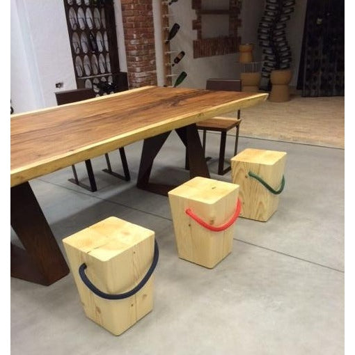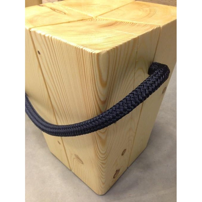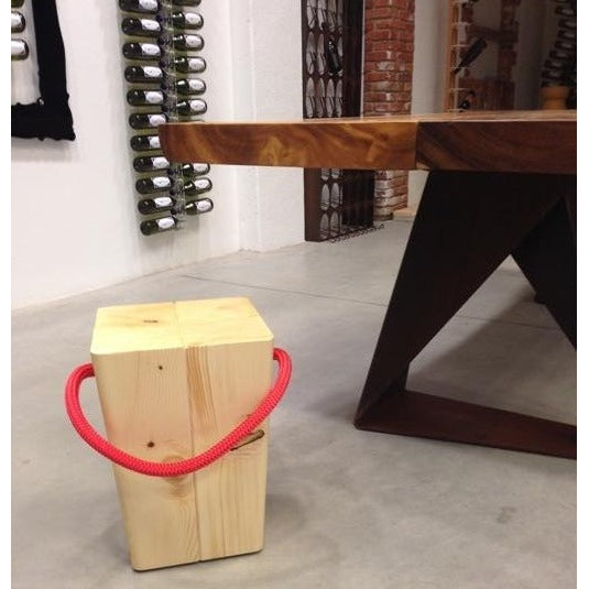 <p><strong>Tabouret</strong> en <strong>sapin naturel ou teinté</strong> avec poignée en corde de couleur <strong>bleu marine, vert anglais, rouge, chanvre, blanc ou noir</strong> .</p>