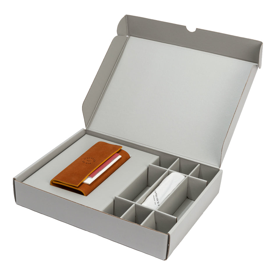 Realizado en acetato de carey y latón con baño de plata, se presenta en un estuche de suave piel hecho a mano.