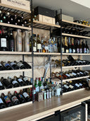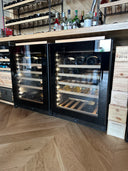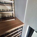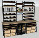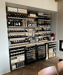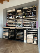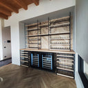 Struttura su misura composta da ripiani e montanti in tondino di acciaio laccato nero - frontalino dei ripiani in legno massello - ripiano porta calici - Top in rovere massello - Cantinette frigo full glass con maniglia incassata