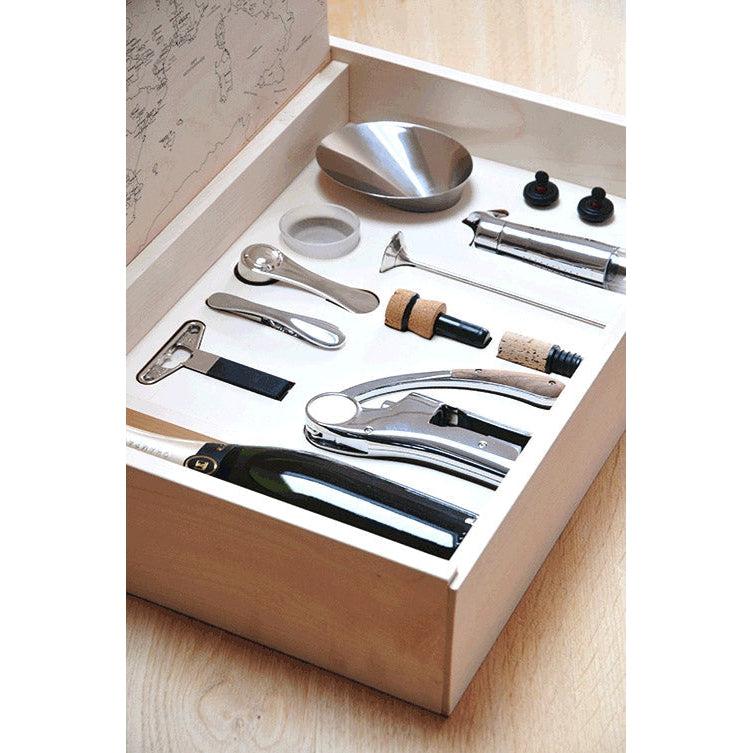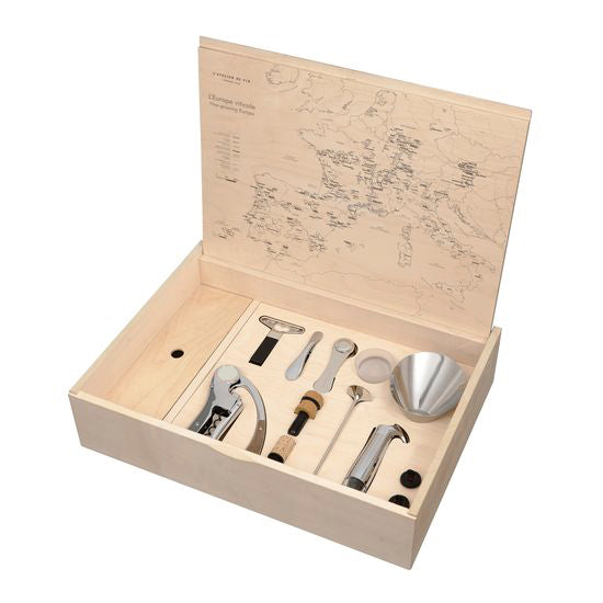<p>Gereedschap om stille en mousserende wijnen te openen, serveren en bewaren in een aantrekkelijke houten geschenkverpakking.</p>