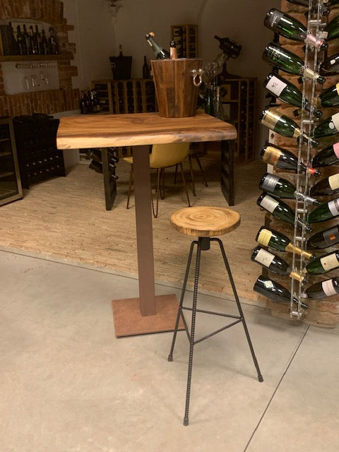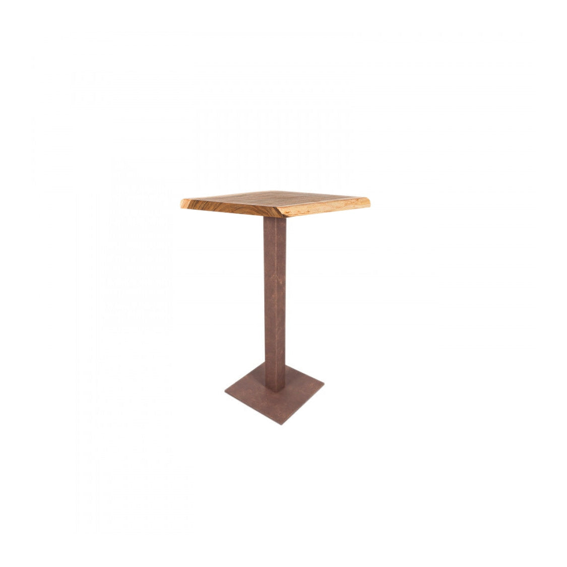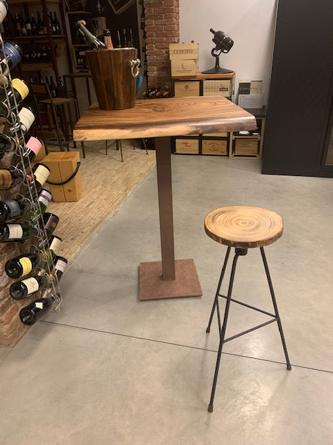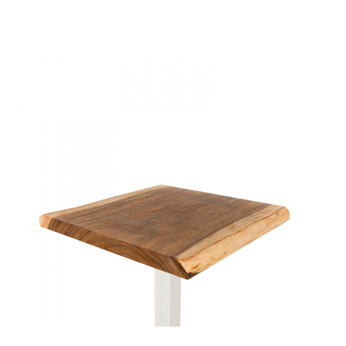 Stolik kawowy z litego, naturalnego drewna Suar z białą żelazną nogą, dostępny również w wykończeniu corten lub czarnym. Drewniany blat ma grubość 5 cm.