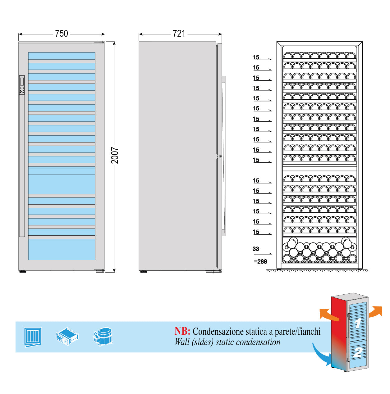 <p>Temperatura regolabile: da +5° a +20°C <i>(superiore)</i> a +5° a +20°C <i>(inferiore)</i><br>Libera Installazione<br>Refrigerazione ventilata<br>Porta in Acciaio Inox con vetro basso emissivo<br>Pannello comandi con display LCD sulla maniglia porta<br>LED laterali a luce calda<br>17 Ripiani in Legno con guide telescopiche<br><span style="background-color:rgb(255,255,255);color:rgb(0,170,255);">Tecnologia&nbsp;INVERTER</span><span style="background-color:rgb(255,255,255);color:rgb(68,68,68);"> </span><i>(riduzione consumi)</i><br><span style="color:rgb(33,43,54);">Classe energetica G </span><i>(vecchia classe A)</i><br>Capacità: 288 bottiglie da 0,75 lt.</p><figure class="image"><img src="{{media url=" alt=""></figure>