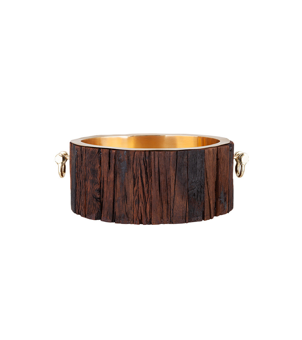 Ricavato da assi di legno di recupero assemblate ed invecchiate ottenendo uno straordinario effetto vintage, completato con vasca e manici a forma di anello in acciaio oro. Ideale per 2/3 bottiglie.
