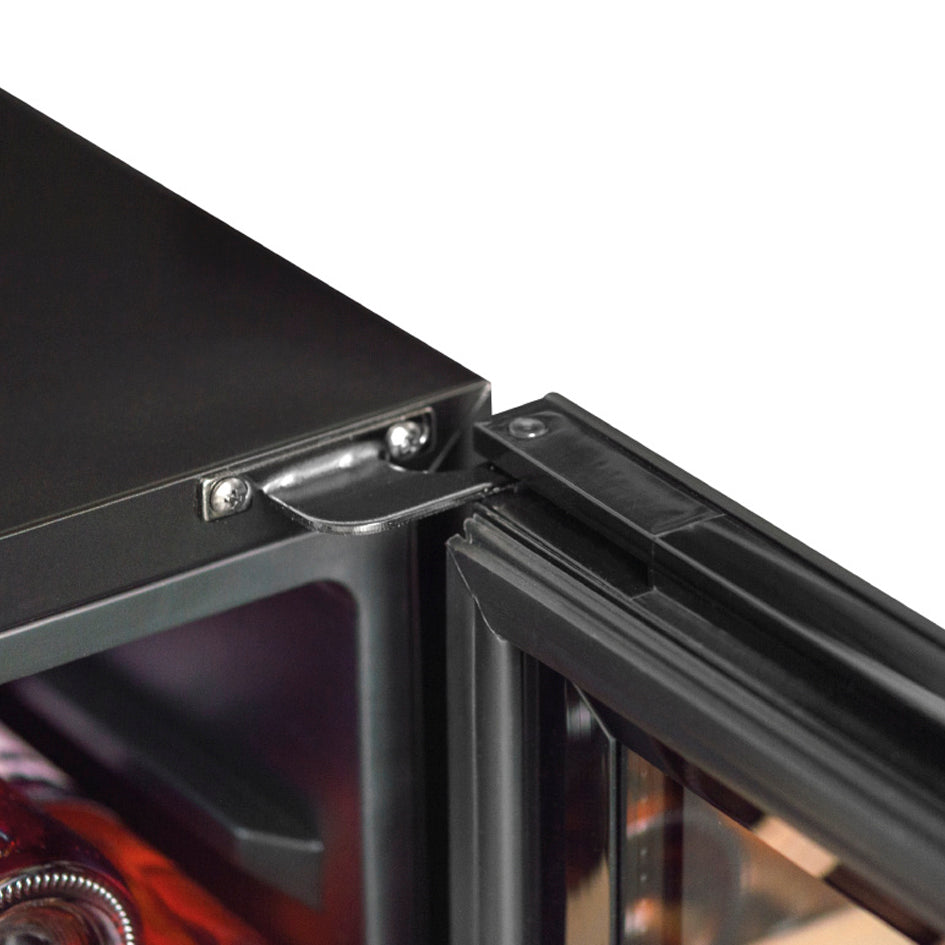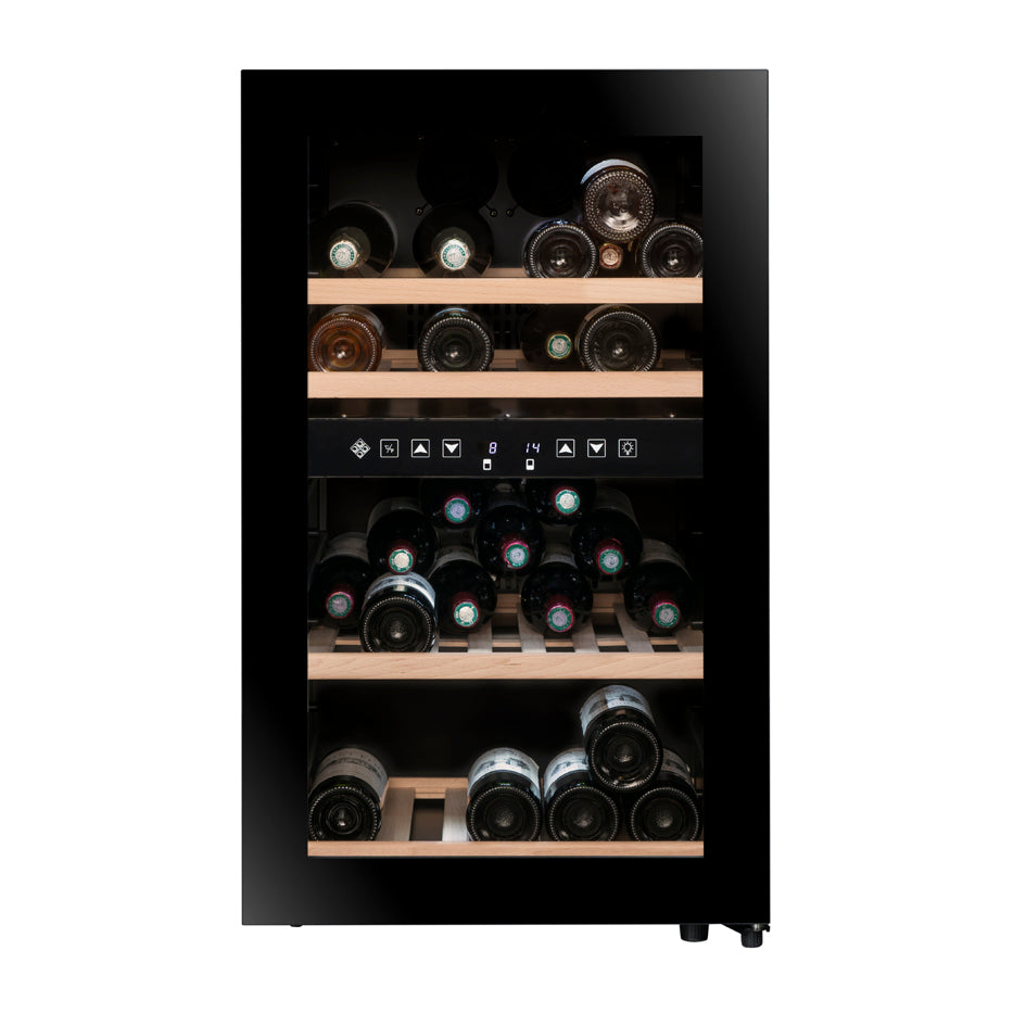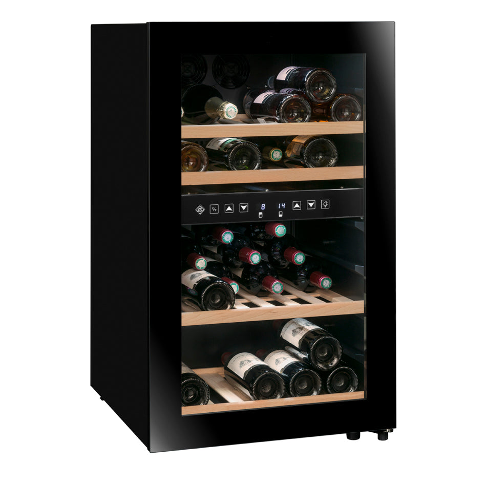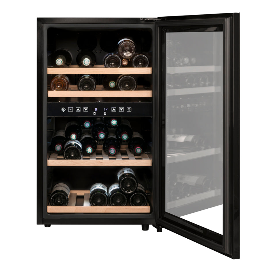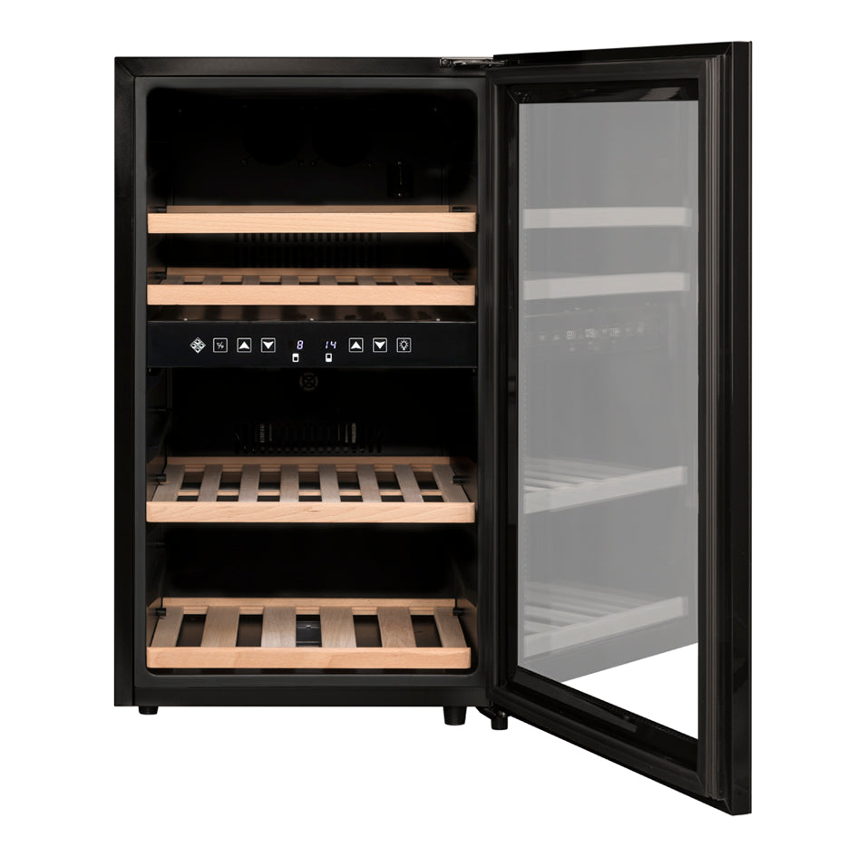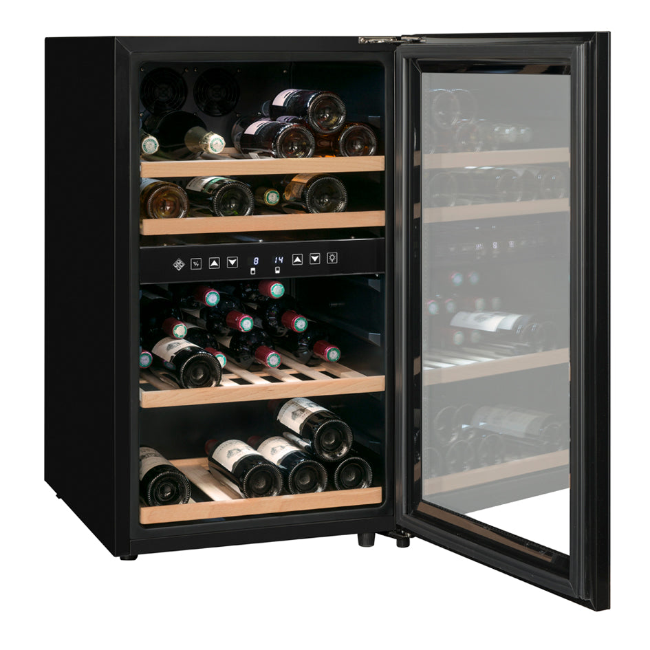 <p><span style="color:rgb(33,43,54);">Capacità: 45 bottiglie*</span><br><span style="color:rgb(33,43,54);">Libera Installazione</span><br><span style="color:rgb(33,43,54);">Colore: Black</span><br><span style="color:rgb(33,43,54);">Sistema di raffreddamento: Compressore</span><br><span style="color:rgb(33,43,54);">Refrigerazione: Ventilata</span><br><span style="color:rgb(33,43,54);">Temperatura Regolabile:</span><br><span style="color:rgb(33,43,54);">- zona superiore: da 5°C a 10°C (21 Bottiglie)</span><br><span style="color:rgb(33,43,54);">- zona inferiore: da 10°C a 18°C (24 Bottiglie)</span><br><span style="color:rgb(33,43,54);">Regolazione elettronica</span><br><span style="color:rgb(33,43,54);">Termometro digitale con display bianco</span><br><span style="color:rgb(33,43,54);">Illuminazione LED bianca con tasto di accensione</span><br><span style="color:rgb(33,43,54);">Porta a doppio vetro grigio temperato trattato anti-UV</span><br><span style="color:rgb(33,43,54);">Compatibile con l'applicazione&nbsp;</span><a href="https://cdn.shopify.com/s/files/1/0561/8535/6486/files/VINOTAG.pdf?v=1663343823"><span style="color:rgb(150,0,0);"><strong>VINOTAG®</strong></span></a><br><span style="color:rgb(33,43,54);"><i>(vedi caratteristiche, in collaborazione con VIVINO)</i></span></p>